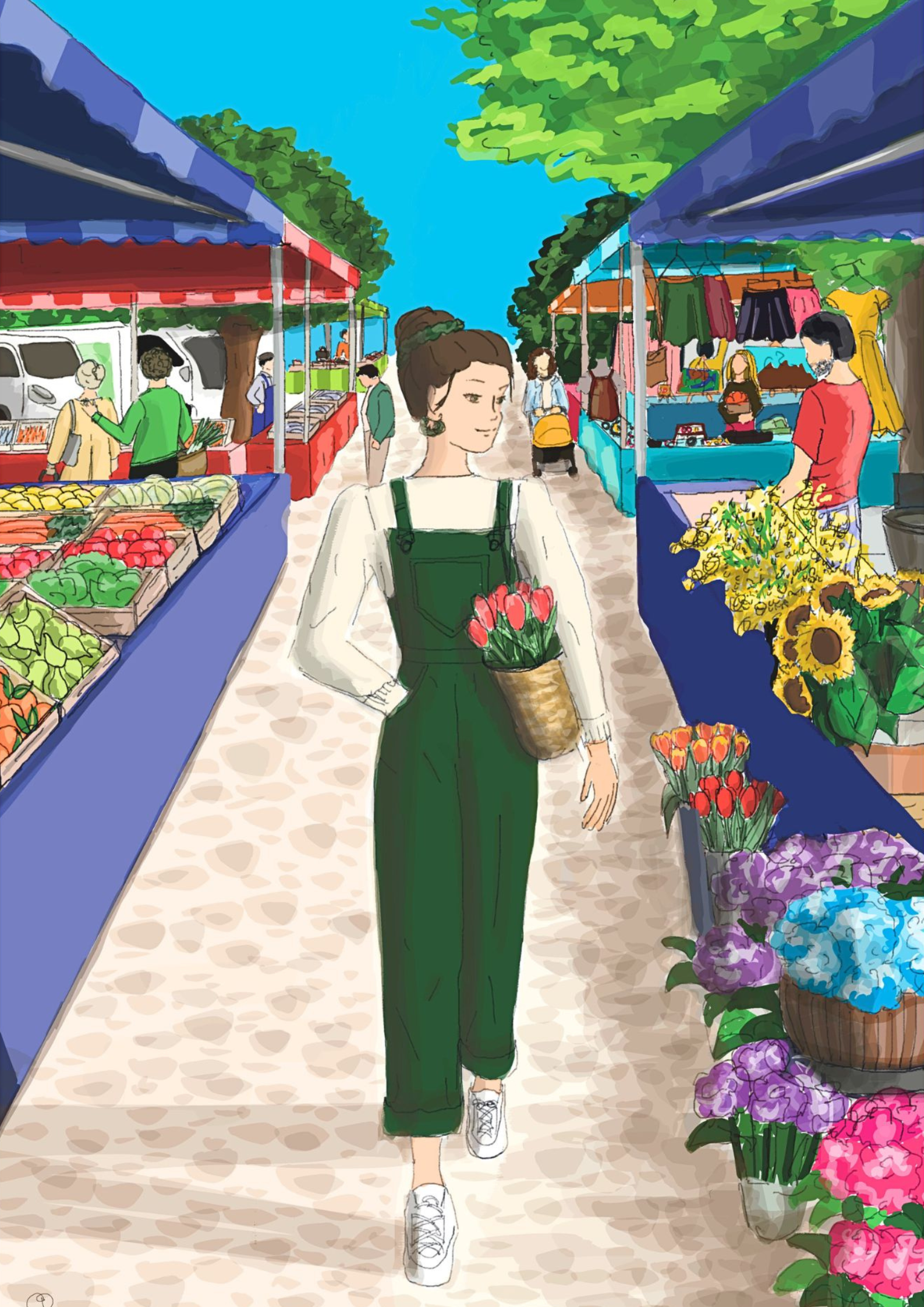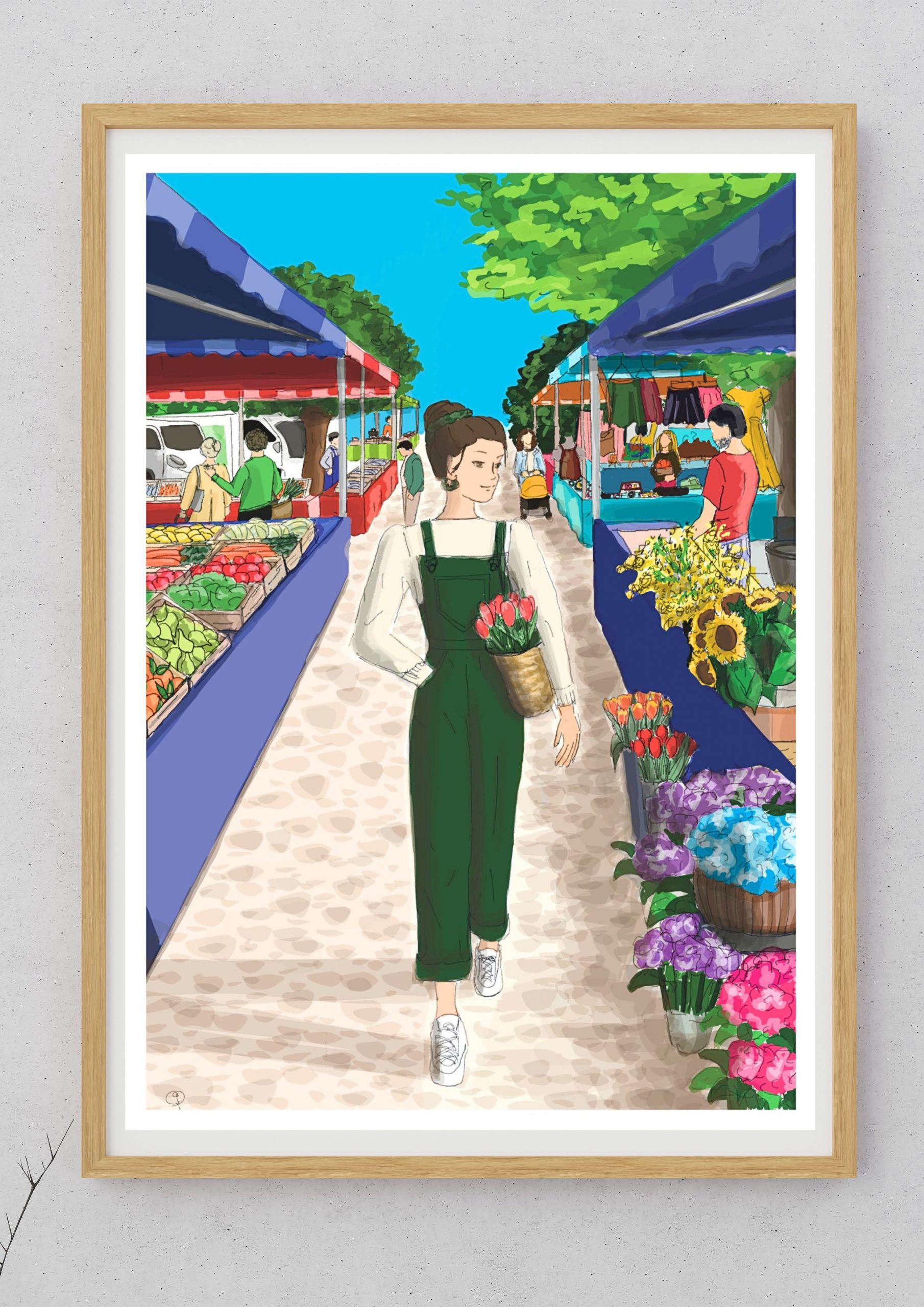 L’illustration Le Marché fait référence à tous ces moments simples et colorés de la vie. Aller faire un petit tour au marché et apprécier les étalages de fruits ou de fleurs, repartir avec un bouquet sous le bras et la joie d’avoir vécu l’instant présent le temps d’un dimanche matin. Royal !